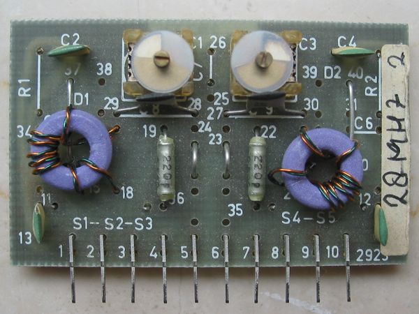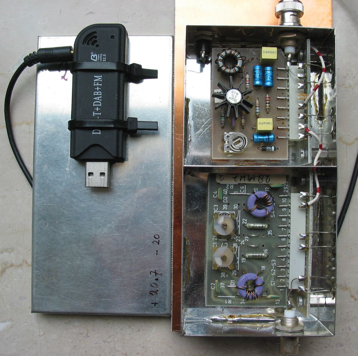 Band-pass filter 28 MHz , High-frequency amplifier BFW16A , RTLdongle/USB stick tuned from 28 to 30 MHz and the USB connection from a computer to receive 28 to 30 MHz